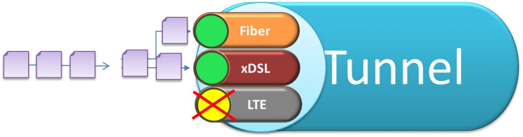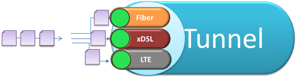 - Beim WAN-Bonding wird ein gemeinsamer Übertragungstunnel als logischer Link über mehrere physikalische WAN-Anschlüsse des SD-WAN Gateways gebildet und so eine Erhöhung des Datendurchsatzes erzielt. Die Daten werden, je nach Bonding-Technologie, z.B. auf IP Paket-Ebene über alle zum Tunnel zugehörigen WAN-Anschlüsse verteilt übertragen.