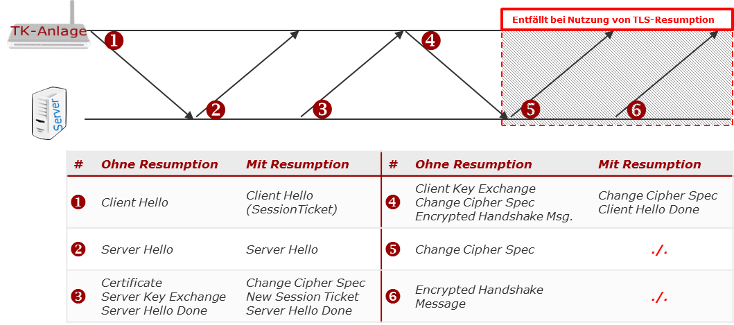 Eine Möglichkeit, die Wiederherstellung der TLS-Session zu beschleunigen, besteht in der Implementierung der im RFC 5077 standardisierten TLS Erweiterung – die „TLS Session Resumption“. Durch die Nutzung der TLS Session Resumption wird der Vorgang der Schlüsselaushandlung abgekürzt und somit die Transportsitzung schneller wiederhergestellt (siehe folgende Abbildung). Die im Rahmen des initialen Verbindungsaufbaus ausgehandelten Verschlüsselungsparameter werden durch den Server in ein sogenanntes „Session-Ticket“ verarbeitet und mit dem Servereigenen öffentlichen Schlüssel chiffriert, bevor es zum Ende des Handshakes an den Client übertragen wird. Soll die (unterbrochene) Verbindung erneut aufgebaut werden, überträgt der Client das Session-Ticket an den Server zurück. Dieser entnimmt die Verschlüsselungsparameter aus dem Ticket und setzt die Session wieder fort.